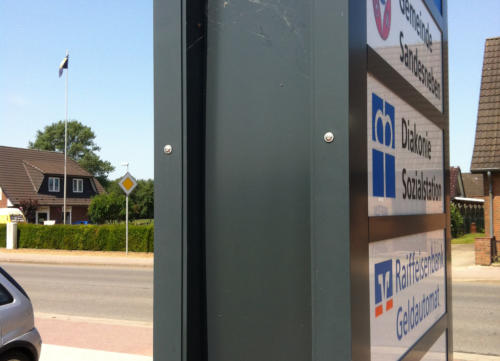 Plane Oberflächen oder gewölbt, aus Kunststoff oder aus Metall (Edelstahl) mit dekupierten Buchstaben oder angstrahlt -